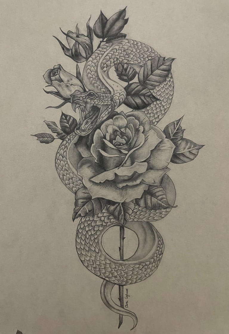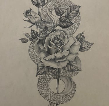 A tattoo-like representation, this drawing is based on the work of... and showcases a snake cooling itself around the petals and leaves of a single rose. One interpretation of this could be that the single central rose is a shy, reluctant self we refuse to share with the world, with the snake, or the persona we portray, wraps itself and guards the rose from the world.